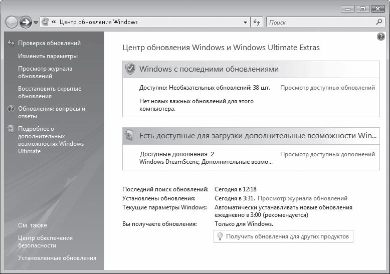 По умолчанию устанавливаемые обновления предназначены для самой Windows, однако если вы пользуетесь и другими продуктами Microsoft, можно настроить получение обновлений и для них. Для этого в окне Центра обновлений Windows перейдите по ссылке Получить обновления для других продуктов и далее следуйте указаниям узла Microsoft Update.